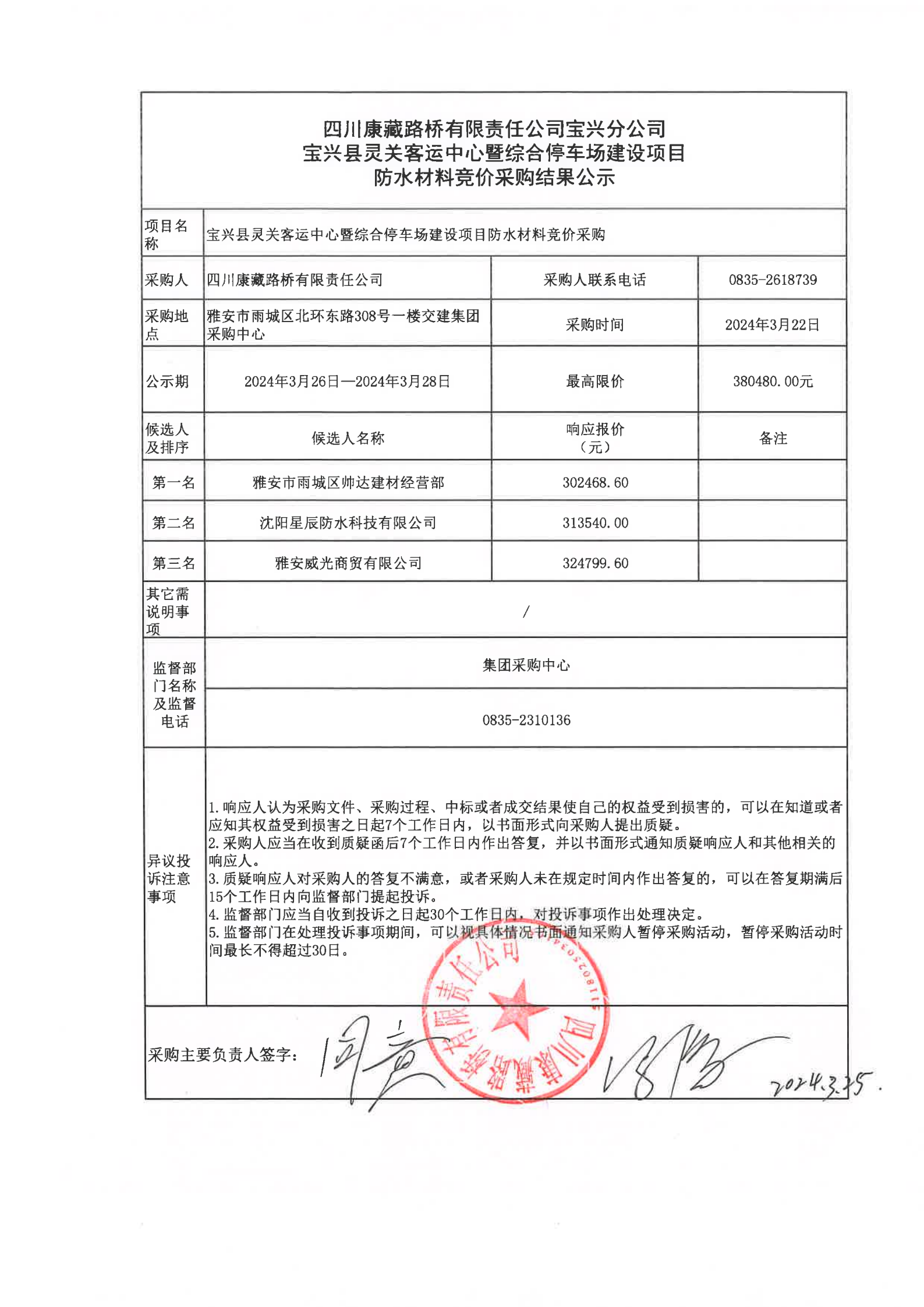 四川康藏路橋有限責任公司寶興縣靈關客運中心暨綜合停車場建設項目防水材料競價采購結果公示