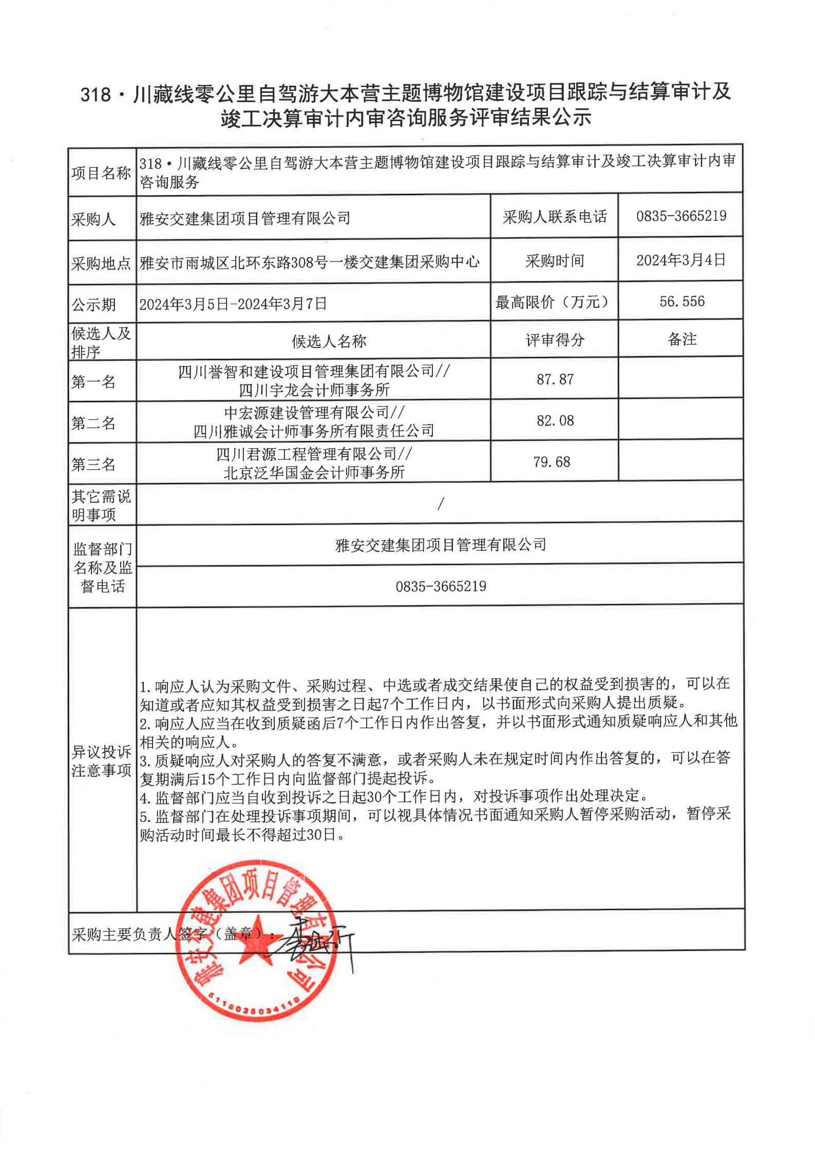 雅安交建集團(tuán)項(xiàng)目管理有限公司318·川藏線零公里自駕游大本營主題博物館建設(shè)項(xiàng)目跟蹤與結(jié)算審計(jì)及竣工決算審計(jì)內(nèi)審咨詢服務(wù)評(píng)審結(jié)果公示