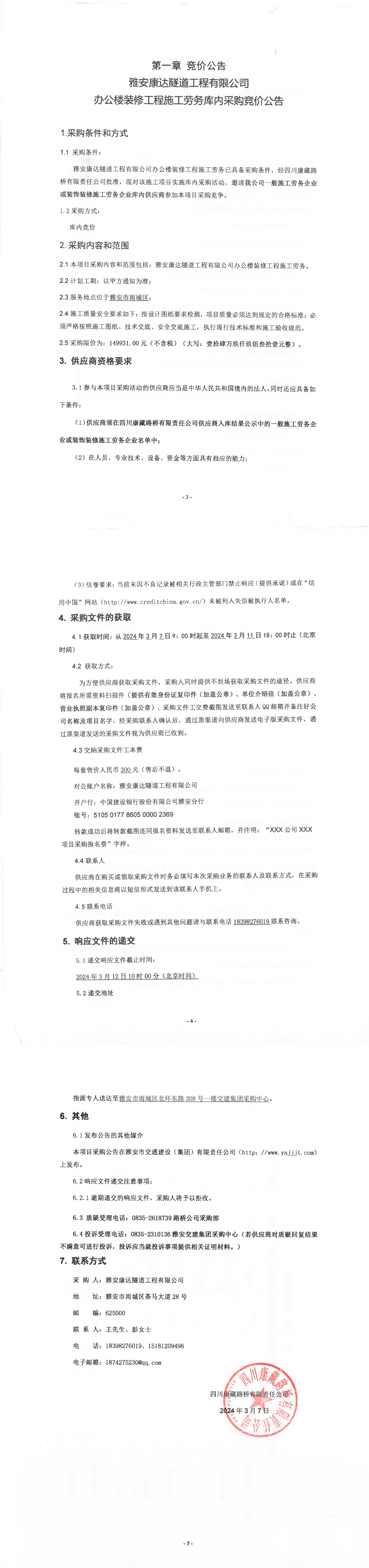 雅安康達隧道工程有限公司辦公樓裝修工程施工勞務庫內(nèi)采購競價公告