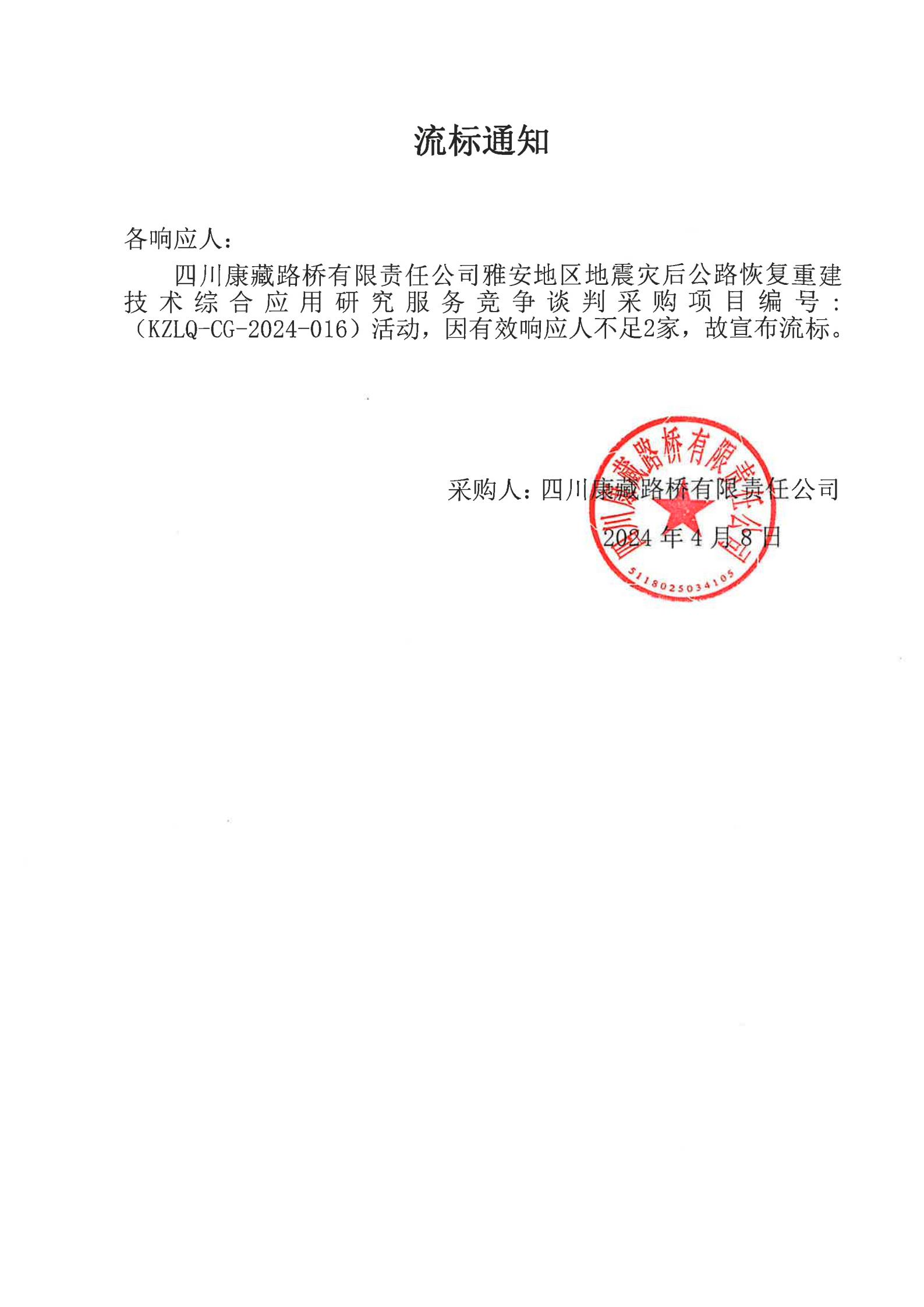 四川康藏路橋有限責任公司雅安地區(qū)地震災(zāi)后公路恢復重建技術(shù)綜合應(yīng)用研究服務(wù)流標通知