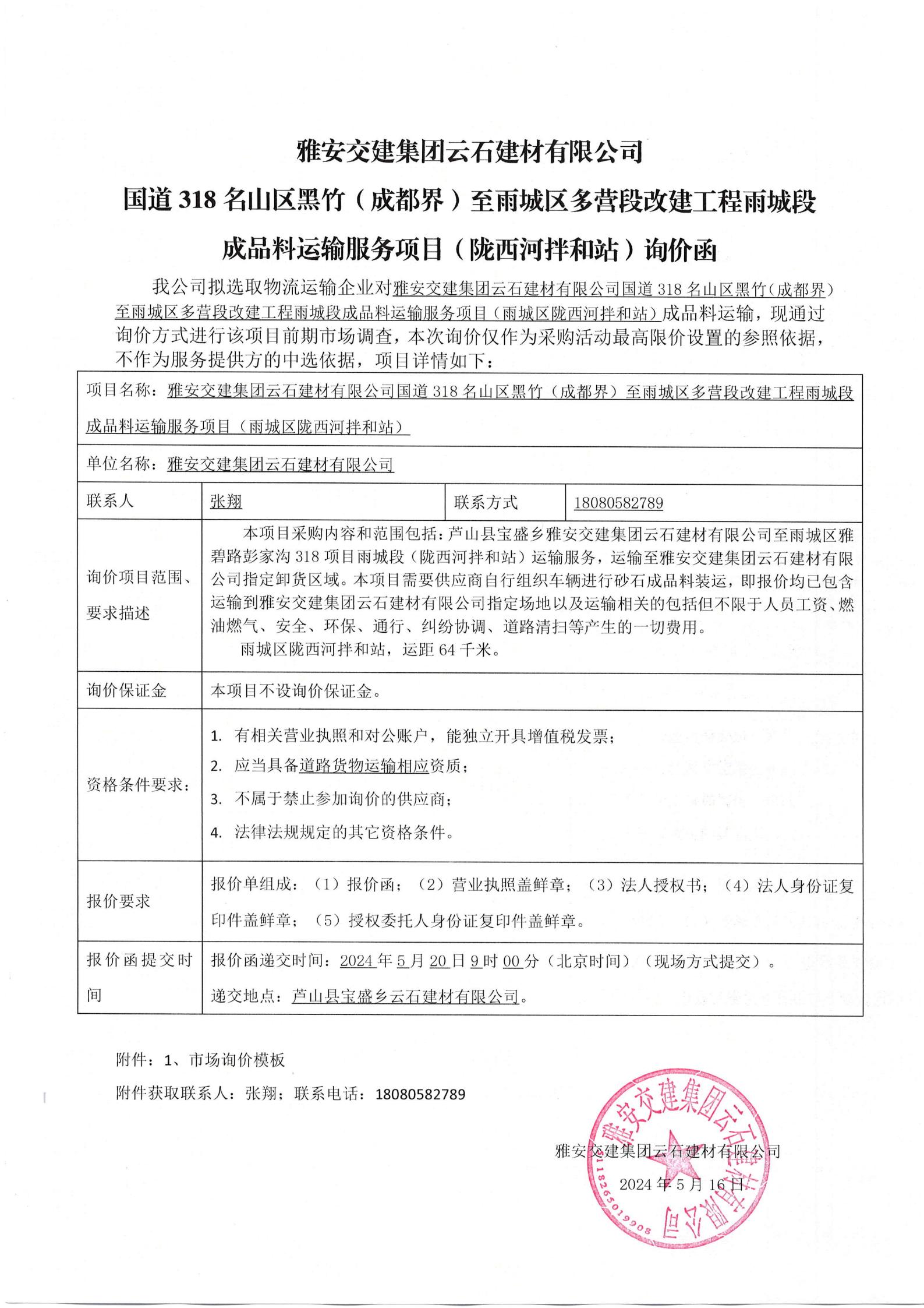 雅安交建集團(tuán)云石建材有限公司國(guó)道318名山區(qū)黑竹(成都界)至雨城區(qū)多營(yíng)段改建工程雨城段成品料運(yùn)輸服務(wù)項(xiàng)目(雨城區(qū)隴西河拌和站)詢價(jià)函