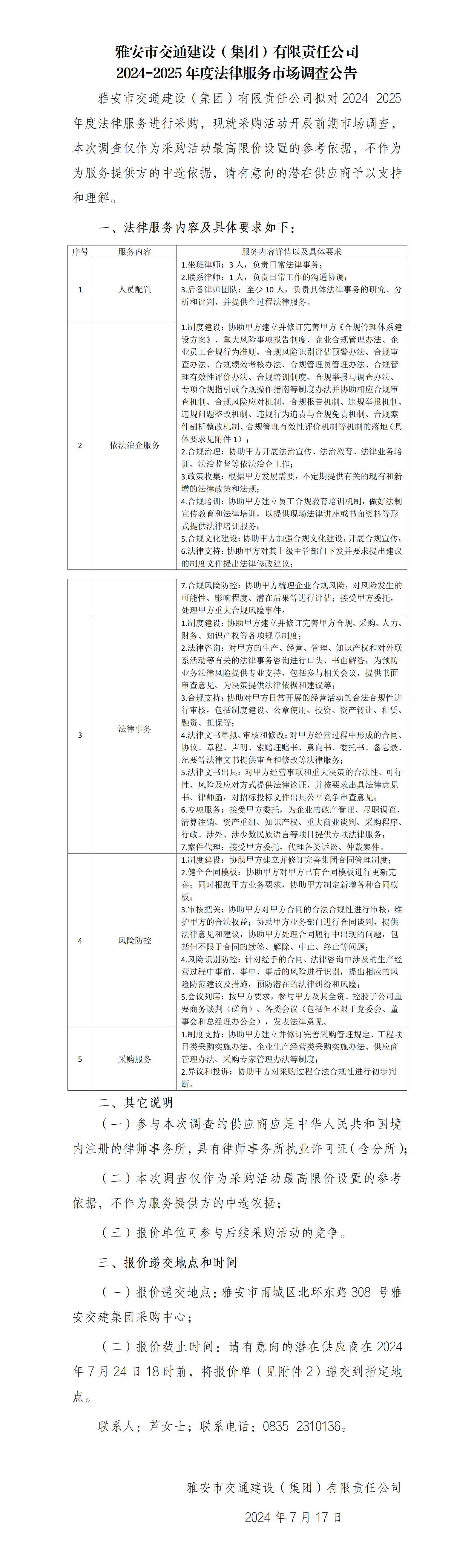 雅安市交通建設(集團)有限責任公司2024-2025年度法律服務市場調查公告