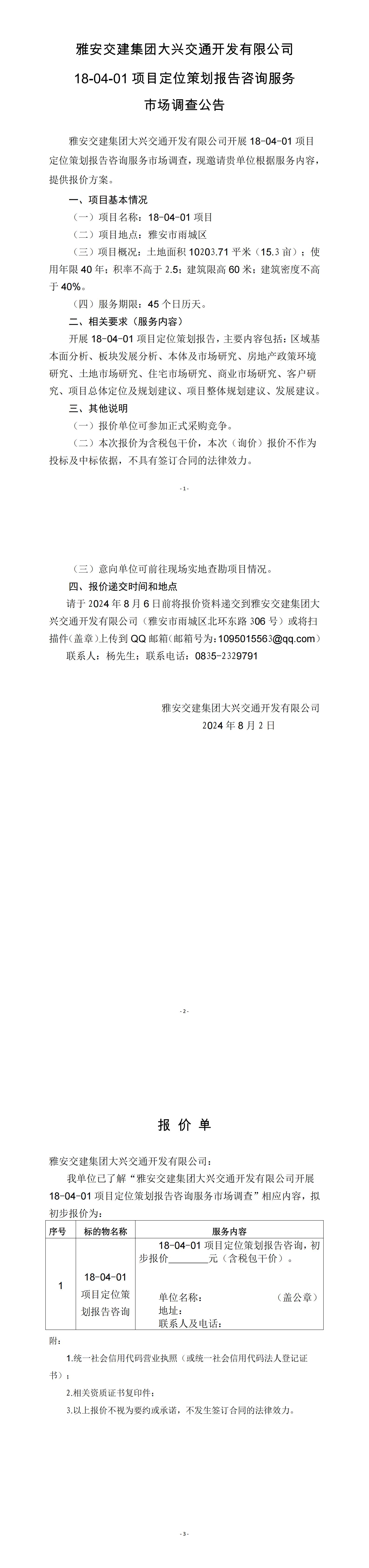 雅安交建集團(tuán)大興交通開(kāi)發(fā)有限公司18-04-01項(xiàng)目定位策劃報(bào)告咨詢(xún)服務(wù)市場(chǎng)調(diào)查公告
