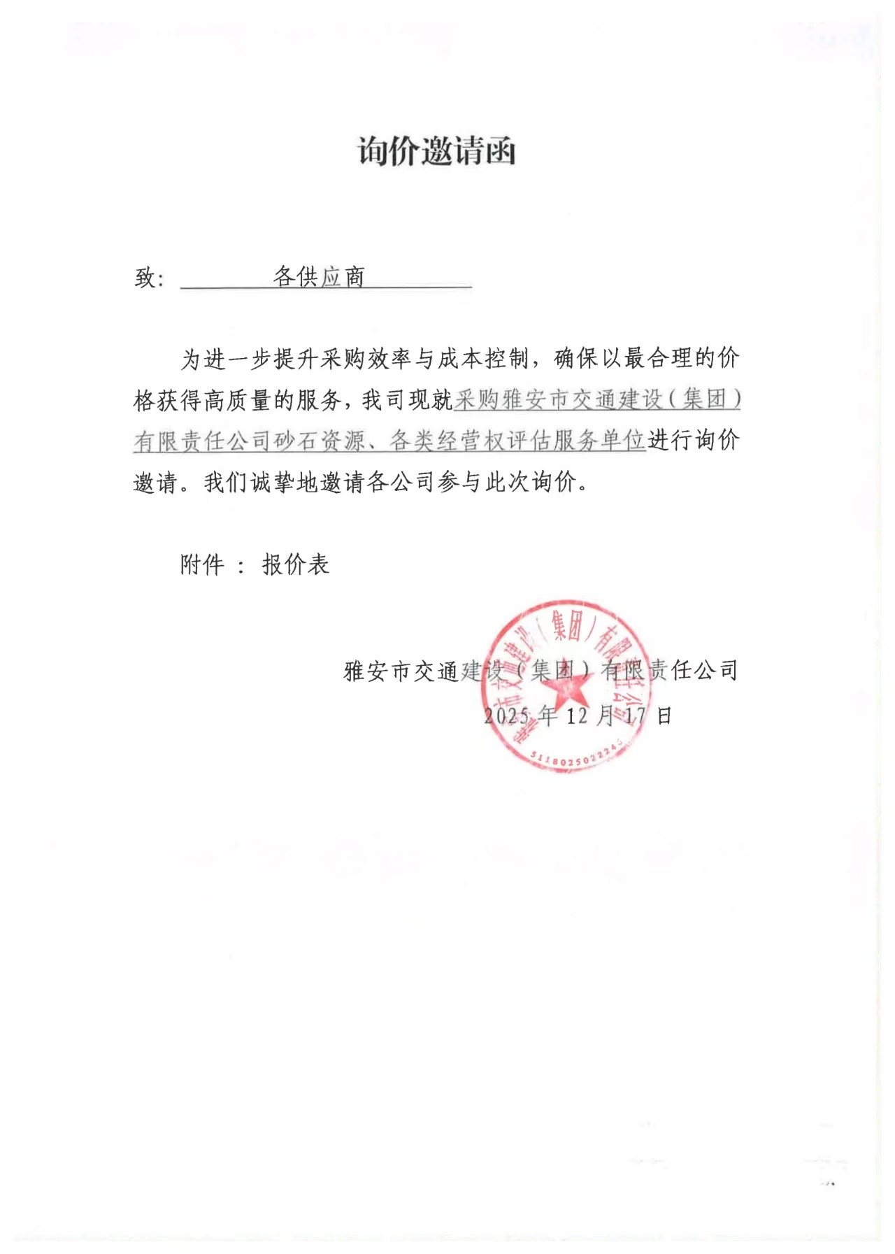 關于雅安市交通建設(集團)有限責任公司砂石資源、各類經(jīng)營權評估服務限價的詢價函