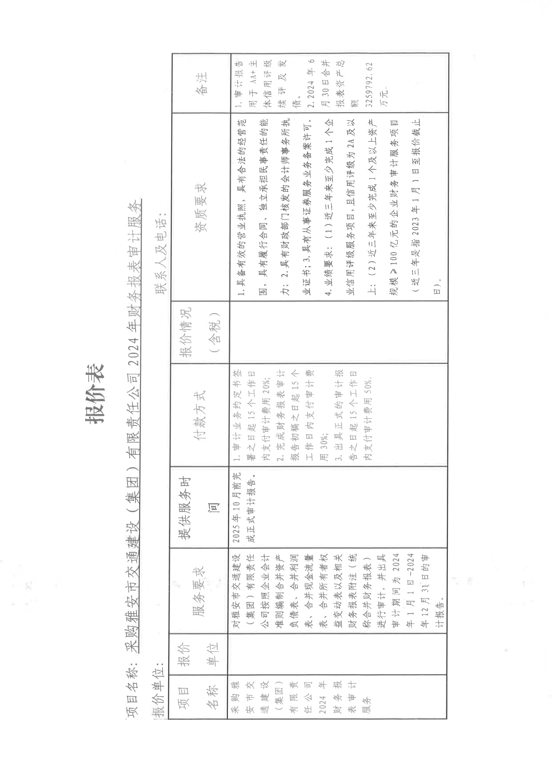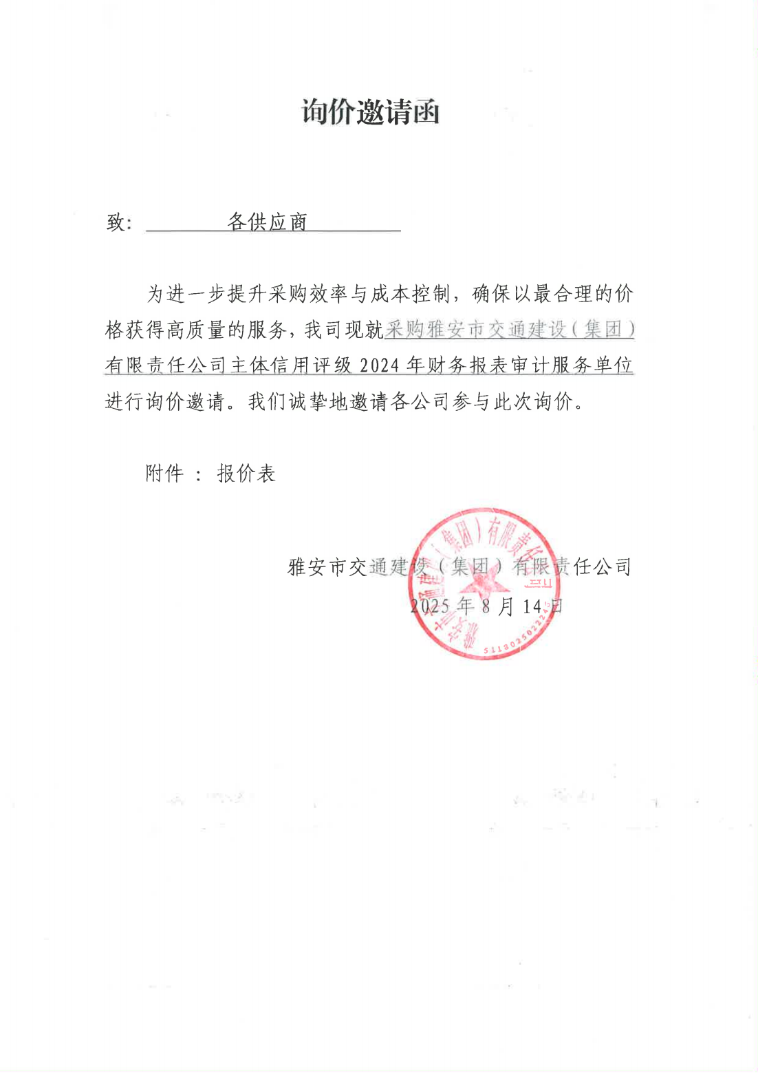 關(guān)于采購雅安市交通建設(shè)(集團(tuán))有限責(zé)任公司主體信用評(píng)級(jí)2024年財(cái)務(wù)報(bào)表審計(jì)服務(wù)單位的詢價(jià)函