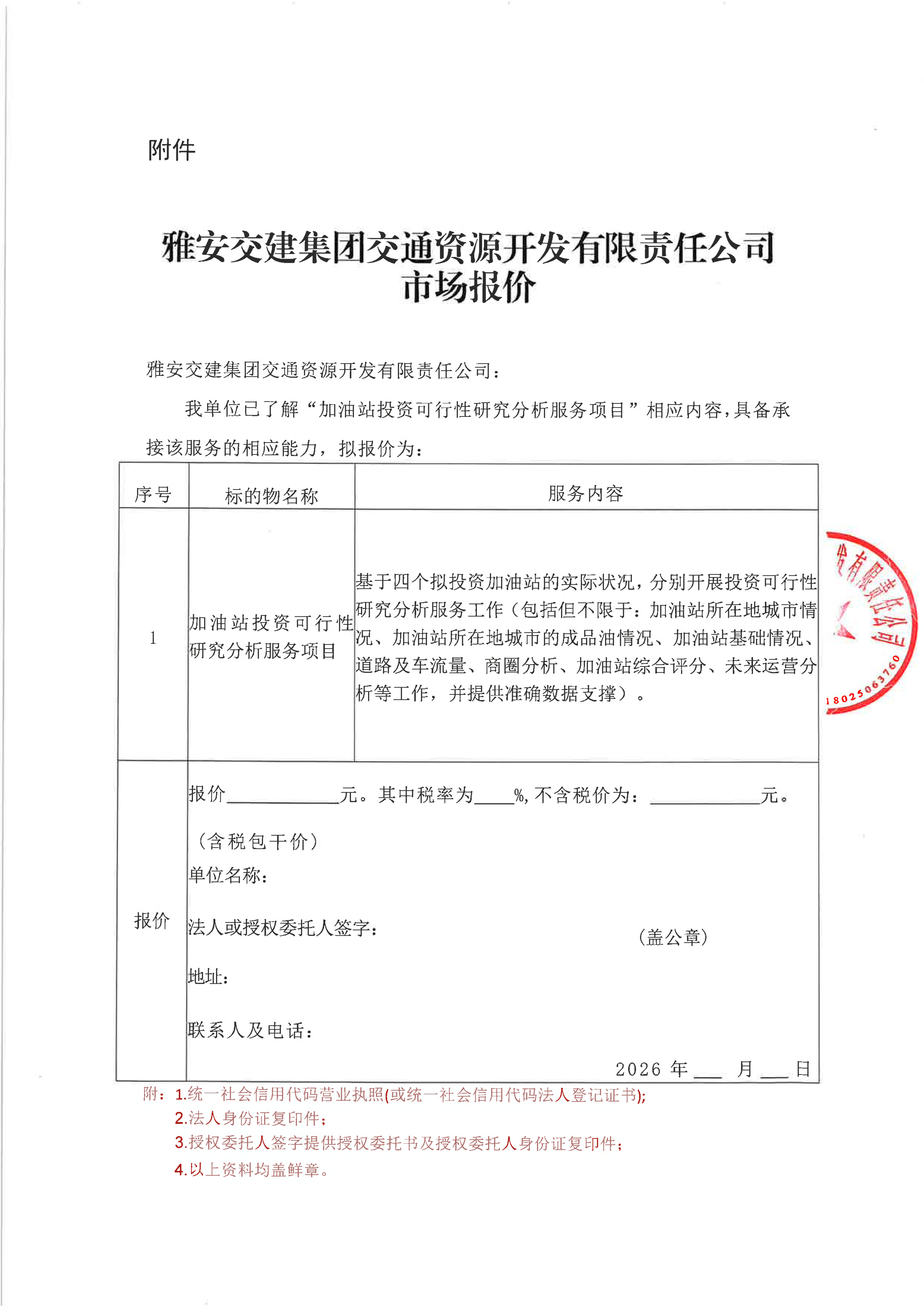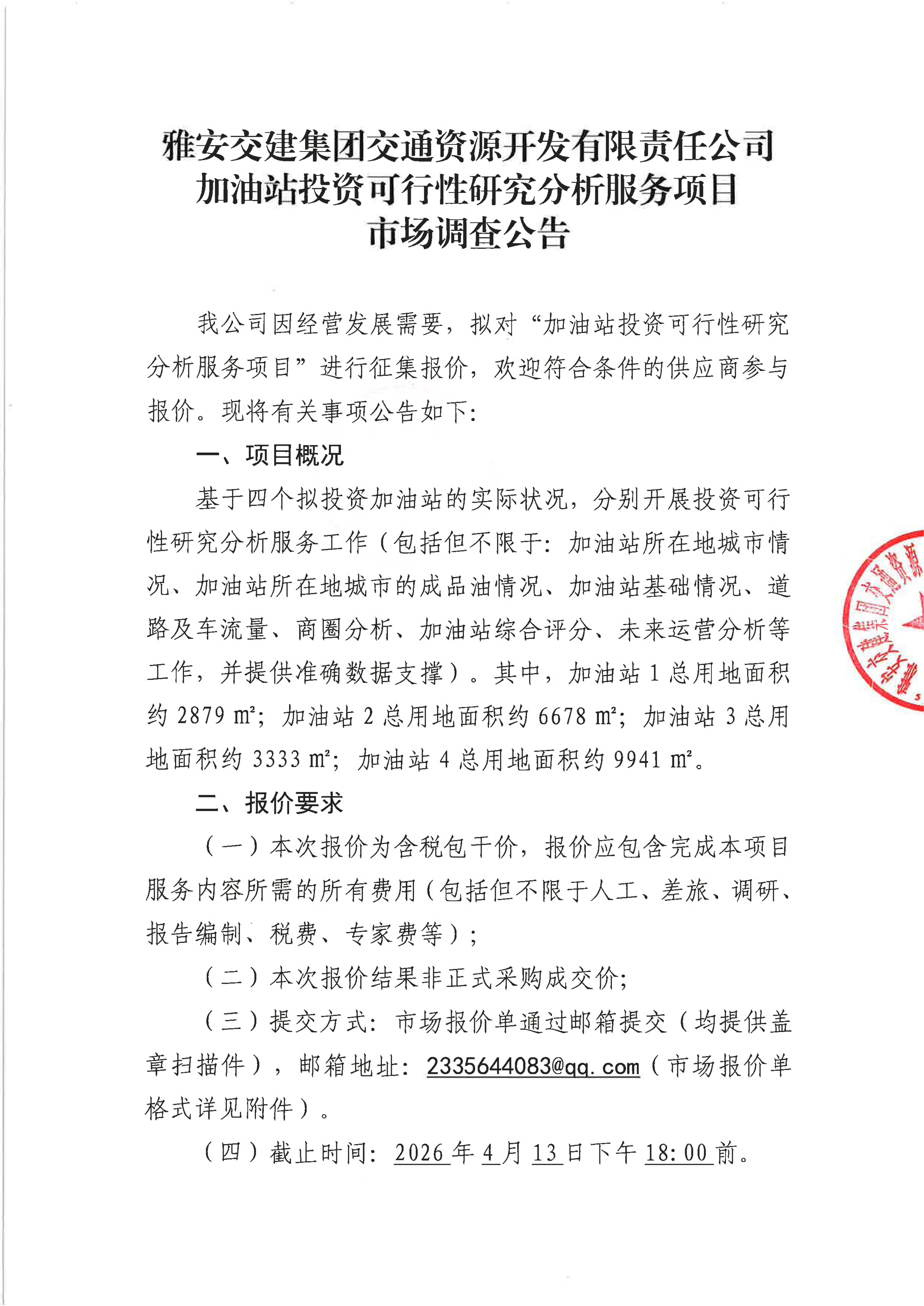 雅安交建集團(tuán)交通資源開發(fā)有限責(zé)任公司加油站投資可行性研究分析服務(wù)項(xiàng)目市場調(diào)查公告
