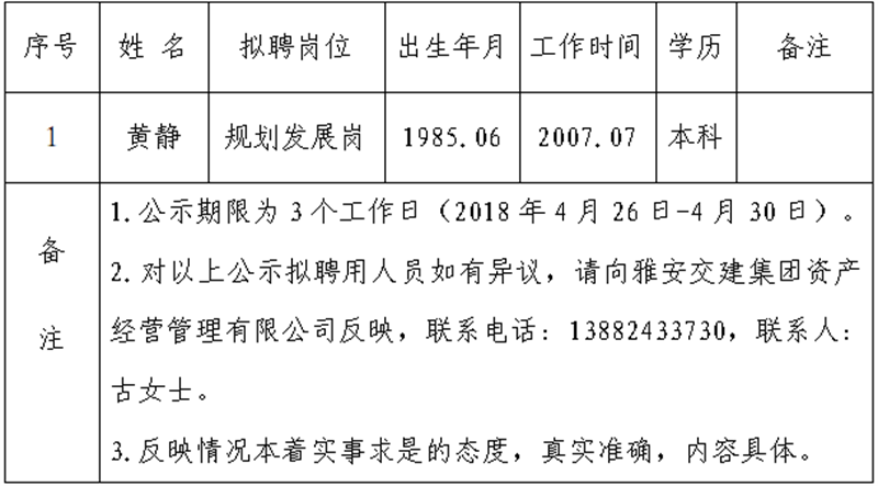 通過公開報名、資格審查、面試等程序,經(jīng)雅安交建集團資產(chǎn)經(jīng)營管理有限公司研究擇優(yōu)確定以下
