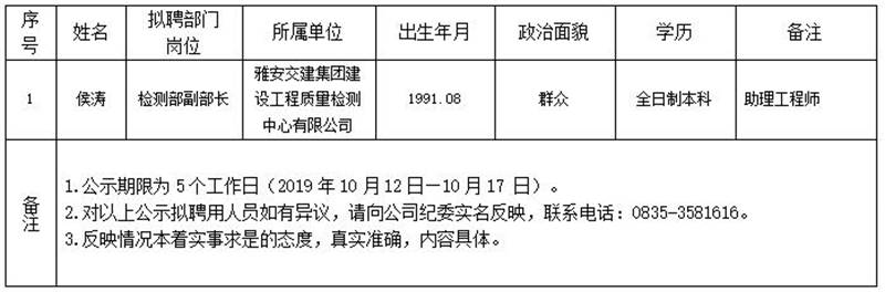 雅安交建集團子公司擬聘用人員公示(工程質(zhì)量檢測中心)