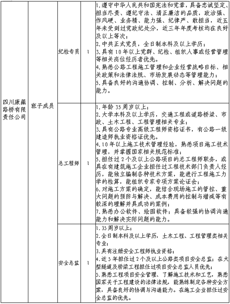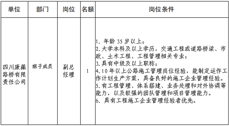 根據(jù)發(fā)展需要,決定面向社會公開招聘雅安市交通建設(shè)(集團(tuán))有限責(zé)任公司(以下簡稱“雅安交建集團(tuán)”)所屬子公司班子成員4名,現(xiàn)將有關(guān)事項公告如下: