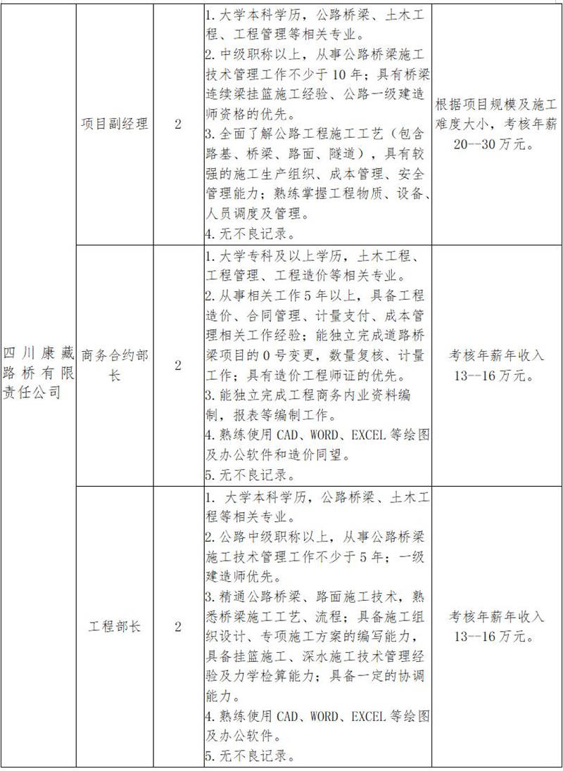 根據(jù)發(fā)展需要,決定面向社會(huì)公開招聘雅安市交通建設(shè)(集團(tuán))有限責(zé)任公司(以下簡(jiǎn)稱“雅安交建集團(tuán)”)所屬子公司工程項(xiàng)目主要負(fù)責(zé)人10名,現(xiàn)將有關(guān)事項(xiàng)公告如下: