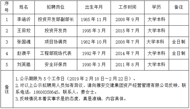 雅安交建集團(tuán)資產(chǎn)經(jīng)營管理有限公司擬聘用人員公示