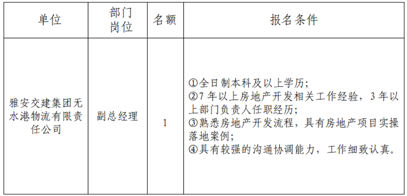 根據(jù)發(fā)展需要,現(xiàn)面向社會(huì)公開招聘雅安市交通建設(shè)(集團(tuán))有限責(zé)任公司(以下簡(jiǎn)稱“雅安交建集團(tuán)”)所屬子公司經(jīng)營(yíng)班子人員1名,現(xiàn)將有關(guān)事項(xiàng)公告如下: