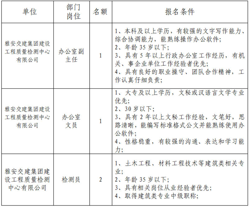 根據(jù)發(fā)展需要,決定面向社會公開招聘雅安市交通建設(集團)有限責任公司(以下簡稱“雅安交建集團”)所屬子公司工作人員4名,現(xiàn)將有關事項公告如下:
