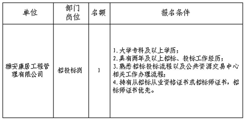 根據(jù)發(fā)展需要,決定面向社會公開招聘雅安市交通建設(shè)(集團(tuán))有限責(zé)任公司(以下簡稱“雅安交建集團(tuán)”)所屬子公司工作人員1名,現(xiàn)將有關(guān)事項公告如下: