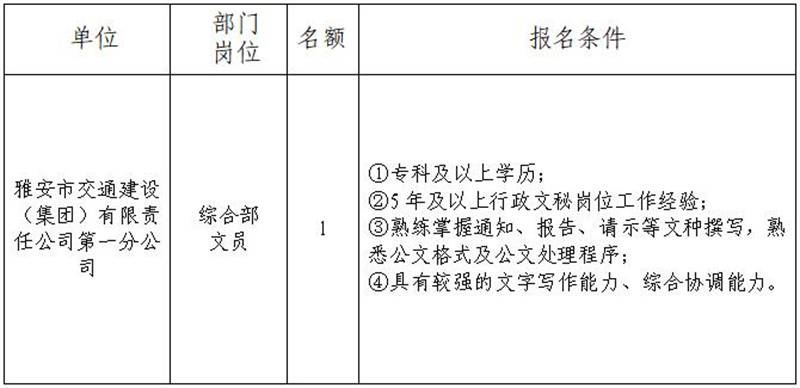 根據(jù)發(fā)展需要,決定面向社會公開招聘雅安市交通建設(shè)(集團)有限責任公司(以下簡稱“雅安交建集團”)所屬分公司工作人員1名,現(xiàn)將有關(guān)事項公告如下: