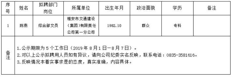 雅安交建集團(tuán)子公司擬聘用人員公示(第一分公司)