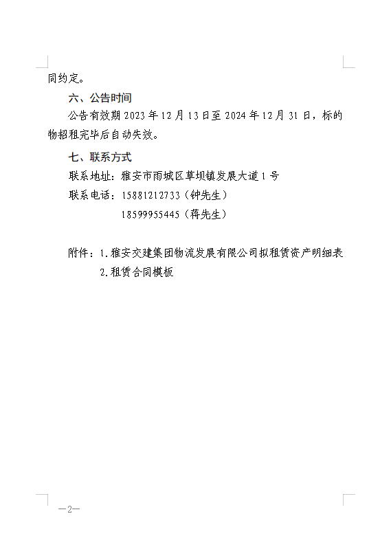 雅安交建集團(tuán)物流發(fā)展有限公司關(guān)于房屋、場(chǎng)地、倉(cāng)庫(kù)公開(kāi)招租的公告附件1、2