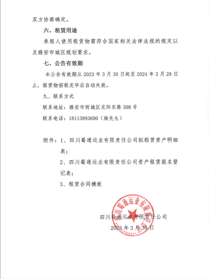 蜀通運(yùn)業(yè)有限責(zé)任公司關(guān)于閑置資產(chǎn)公開(kāi)招租的公告附件
