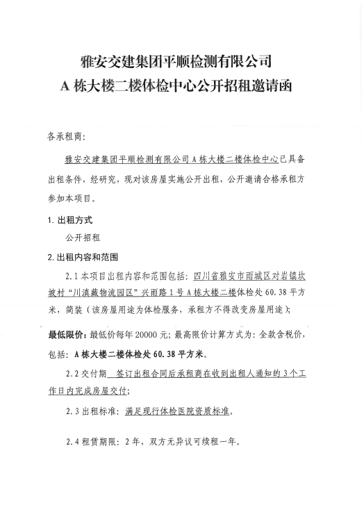 平順公司A棟大樓二樓體檢中心公開招租邀請(qǐng)函