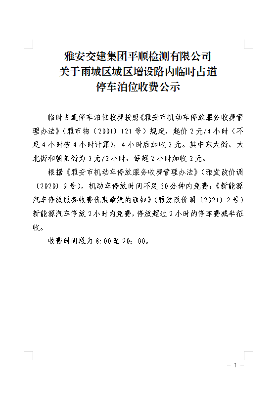 雅安交建集團(tuán)平順檢測(cè)有限公司關(guān)于雨城區(qū)城區(qū)增設(shè)路內(nèi)臨時(shí)占道停車泊位收費(fèi)公示