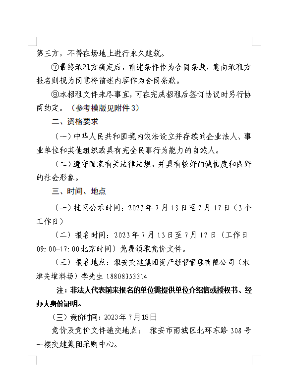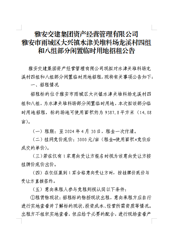 雅安交建集團(tuán)資產(chǎn)經(jīng)營管理有限公司雨城區(qū)大興鎮(zhèn)水津關(guān)堆料場龍溪村四組和八組部分閑置臨時用地招租公告