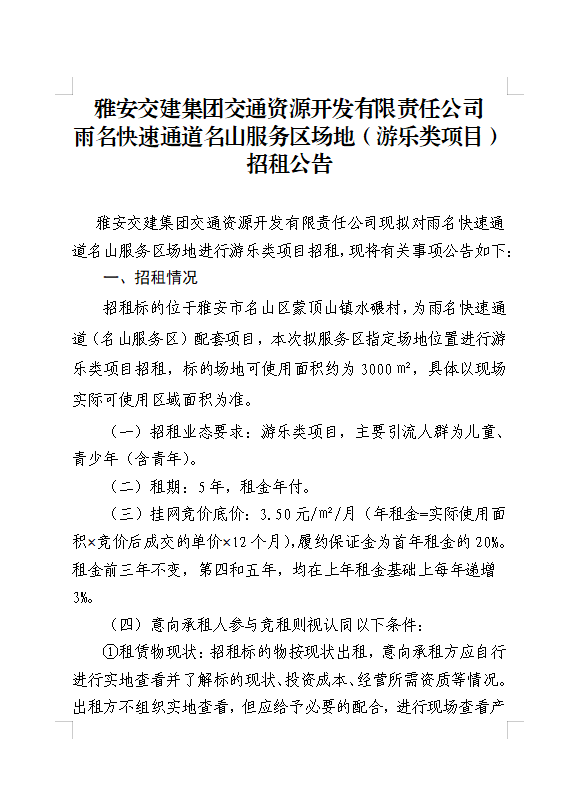 雅安交建集團(tuán)交通資源開(kāi)發(fā)有限責(zé)任公司雨名快速通道名山服務(wù)區(qū)場(chǎng)地(游樂(lè)類項(xiàng)目)招租公告