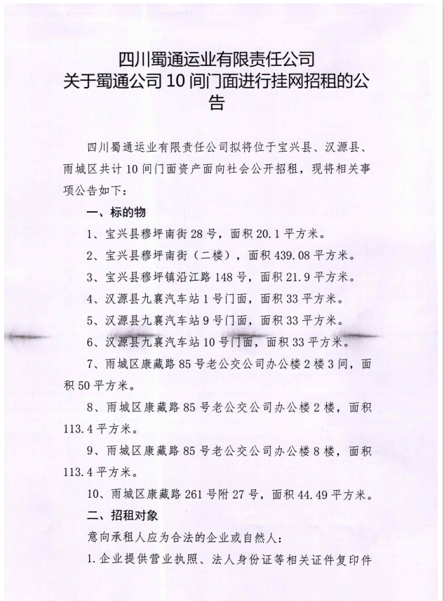 關(guān)于蜀通公司10間門面進(jìn)行掛網(wǎng)招租的公告