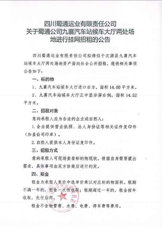 四川蜀通運(yùn)業(yè)有限責(zé)任公司關(guān)于蜀通公司九襄汽車(chē)站候車(chē)大廳兩處場(chǎng)地進(jìn)行掛網(wǎng)招租的公告