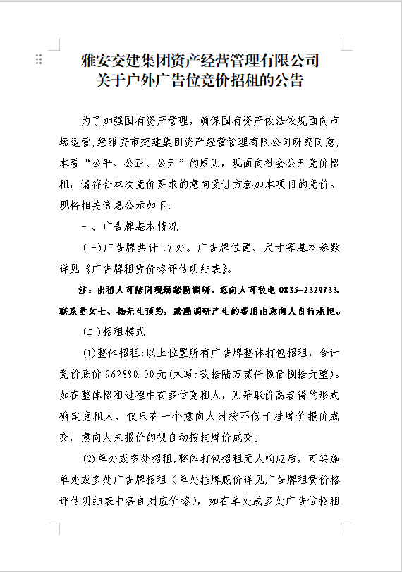 雅安交建集團(tuán)資產(chǎn)經(jīng)營管理有限公司關(guān)于戶外廣告位競價招租的公告