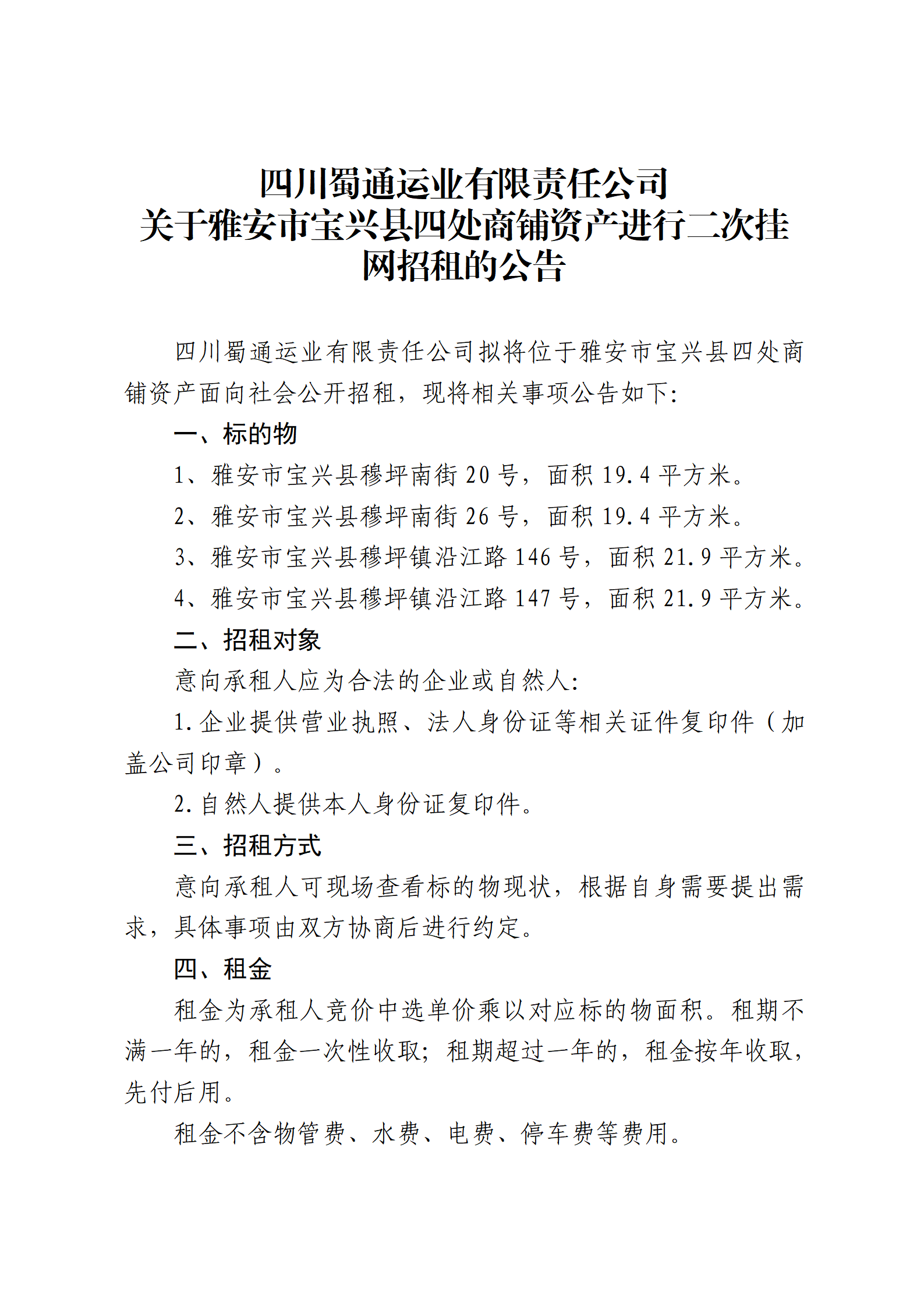四川蜀通運(yùn)業(yè)有限責(zé)任公司 關(guān)于雅安市寶興縣四處商鋪資產(chǎn)進(jìn)行二次掛網(wǎng)招租的公告