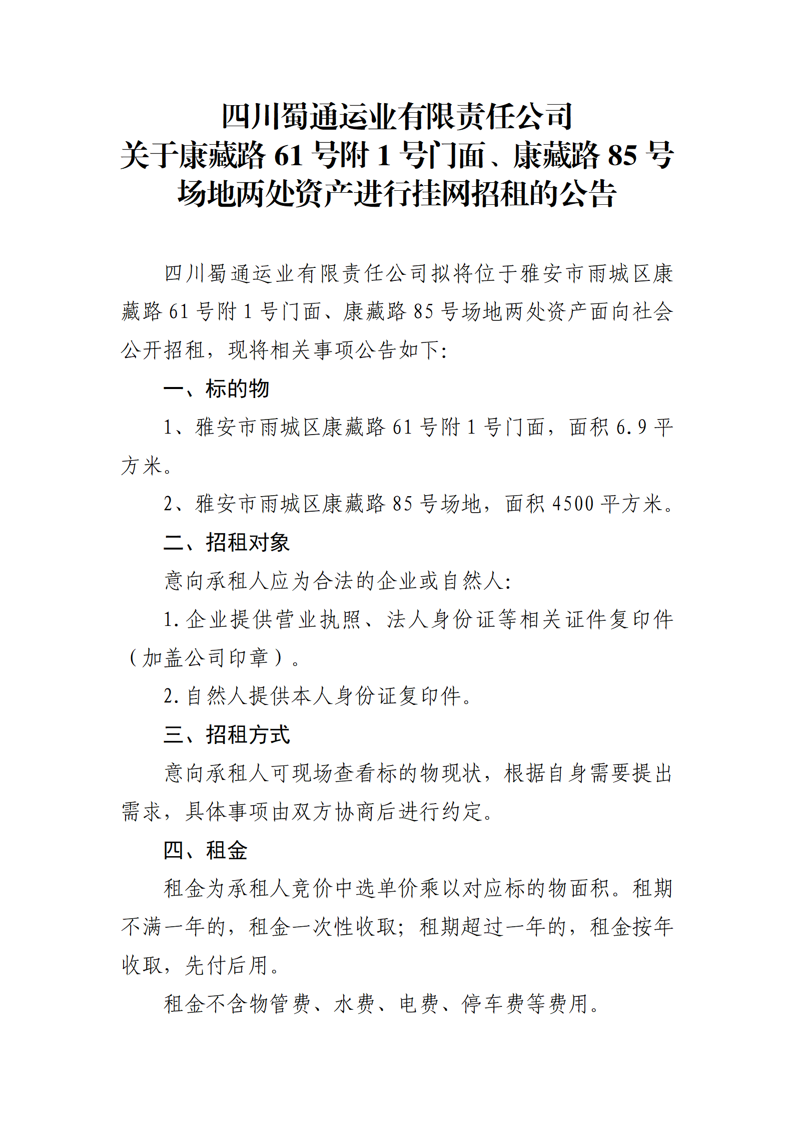四川蜀通運(yùn)業(yè)有限責(zé)任公司 關(guān)于康藏路61號(hào)附1號(hào)門面、康藏路85號(hào)場(chǎng)地兩處資產(chǎn)進(jìn)行掛網(wǎng)招租的公告