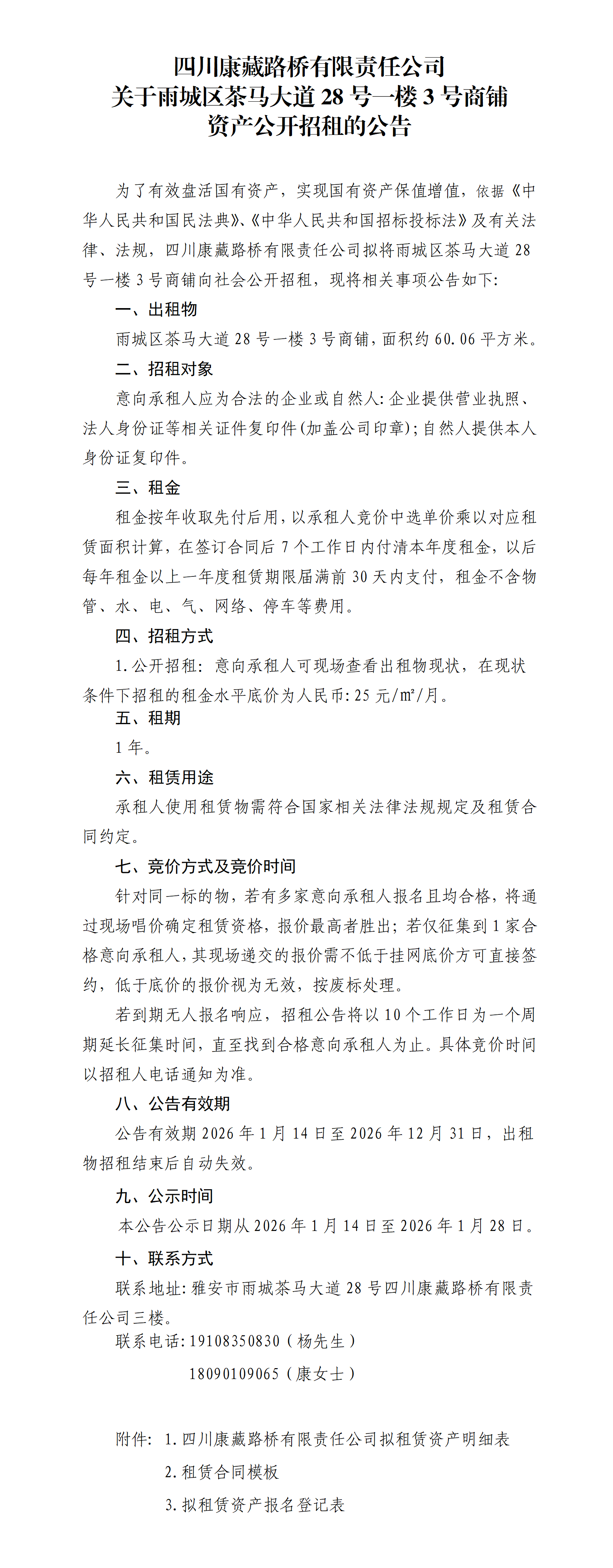 四川康藏路橋有限責任公司關(guān)于雨城區(qū)茶馬大道28號一樓3號商鋪 資產(chǎn)公開招租的公告