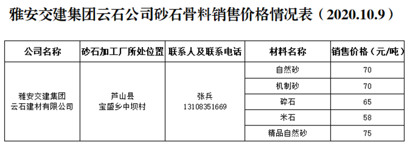 ÑŰ²½»½¨¼¯ˆFÔÆÊ¯¹«Ë¾É°Ê¯¹ÇÁÏäNÊÛƒr¸ñÇé›r±í£¨2020.10.9£©