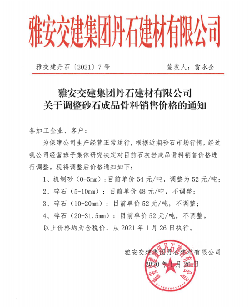 雅安交建集團(tuán)興寶公司砂石骨料銷售價格情況表(2021.1.14)