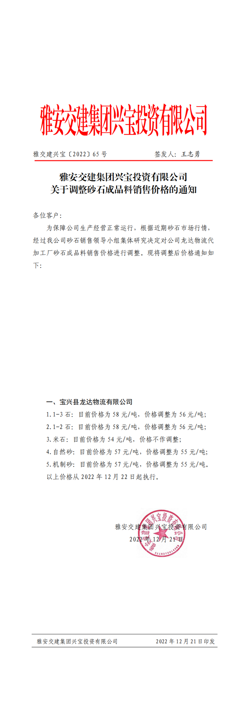 雅交建興寶〔2022〕65號 關(guān)于調(diào)整砂石成品料銷售價格的通知(2022-12-21)