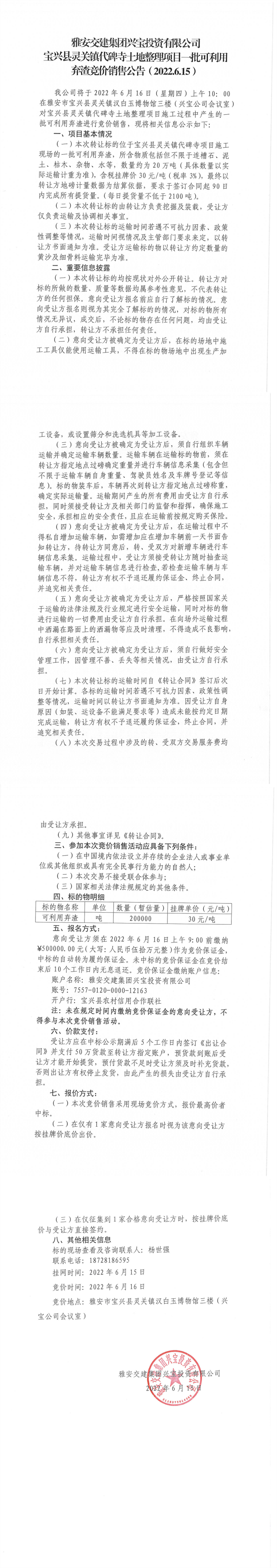 雅安交建集團興寶投資有限公司寶興縣靈關鎮(zhèn)代碑寺土地整理項目-批可利用 棄渣競價銷售公告( 2022.6.15 )