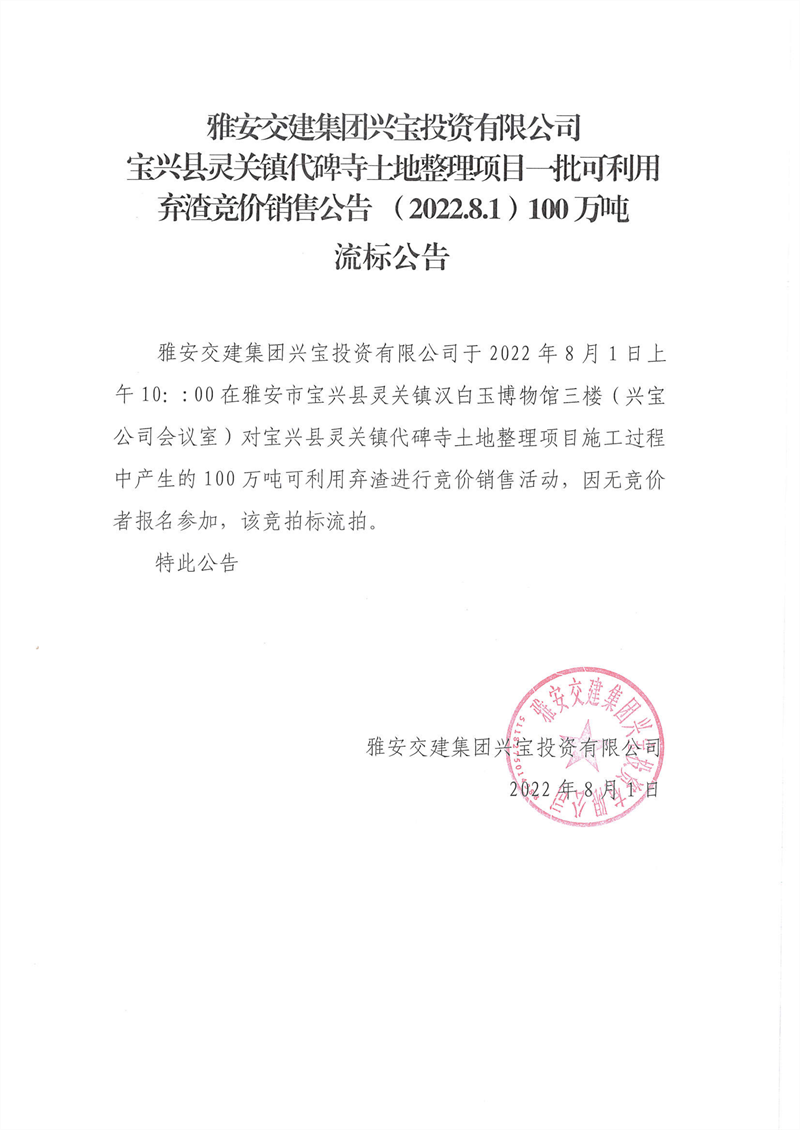 雅安交建集團(tuán)興寶投資有限公司靈關(guān)鎮(zhèn)代碑寺土地整理項(xiàng)目100萬噸可利用棄渣競(jìng)價(jià)銷售流標(biāo)公告(2022.8.1)