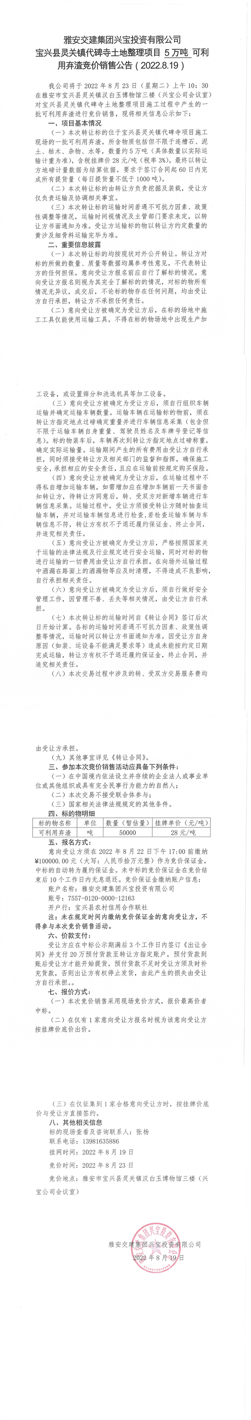 雅安交建集團興寶投資有限公司靈關(guān)鎮(zhèn)代碑寺土地整理項目5萬噸可利用棄渣競價銷售公告(2022.8.19)(1)