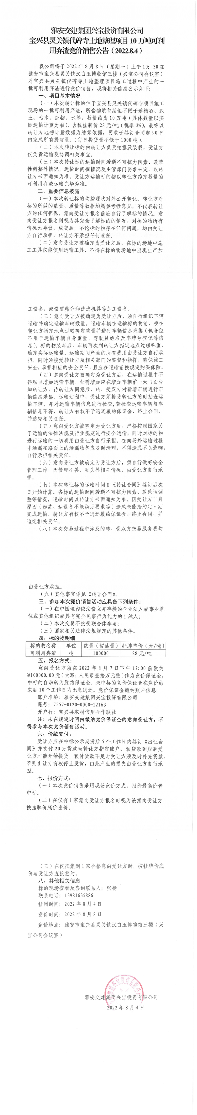 雅安交建集團(tuán)興寶投資有限公司靈關(guān)鎮(zhèn)代碑寺土地整理項(xiàng)目5萬(wàn)噸可利用棄渣競(jìng)價(jià)銷售公告(2022.8.4)