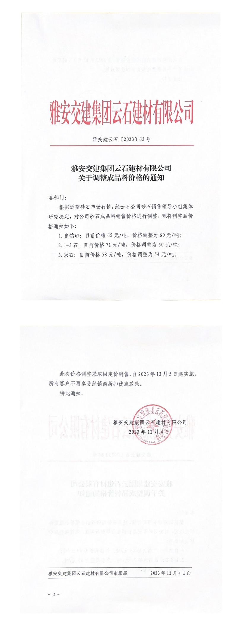 雅安交建集團(tuán)云石建材有限公司成品料銷售價(jià)格調(diào)整公告(2023-12-04)