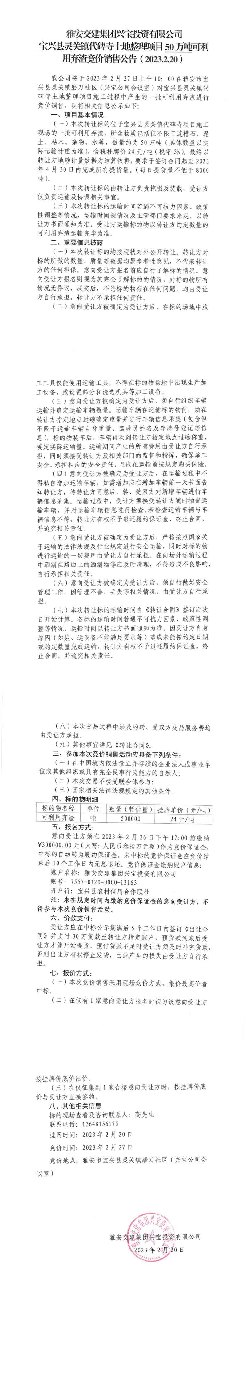 雅安交建集團(tuán)興寶投資有限公司靈關(guān)鎮(zhèn)代碑寺土地整理項目50萬噸可利用棄渣競價銷售公告(2023.2.20)、