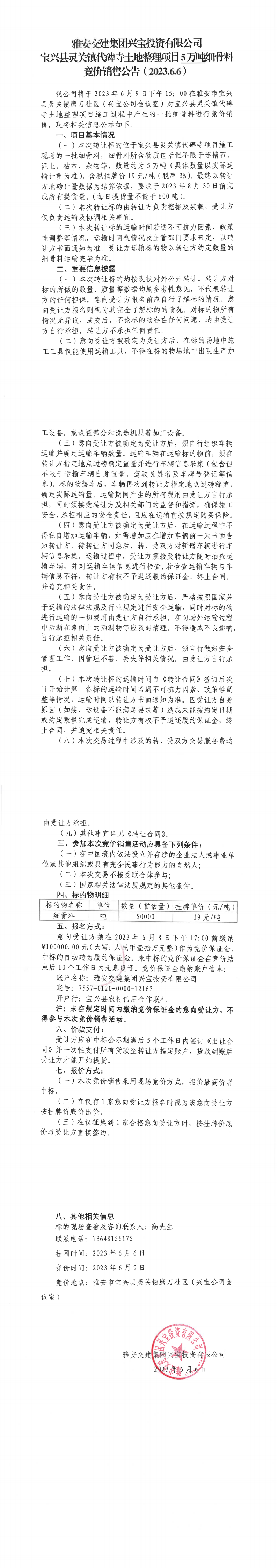 雅安交建集團(tuán)興寶投資有限公司寶興縣靈關(guān)鎮(zhèn)代碑寺土地整理項目5萬噸細(xì)骨料競價銷售公告(2023.6.6)