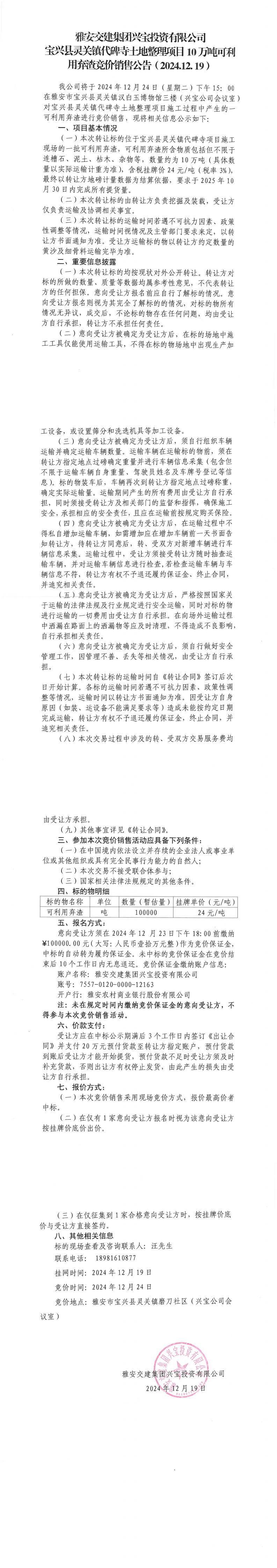 雅安交建集團興寶投資有限公司靈關鎮(zhèn)代碑寺土地整理項目10萬噸可利用棄渣競價銷售公告(2024.12.19)