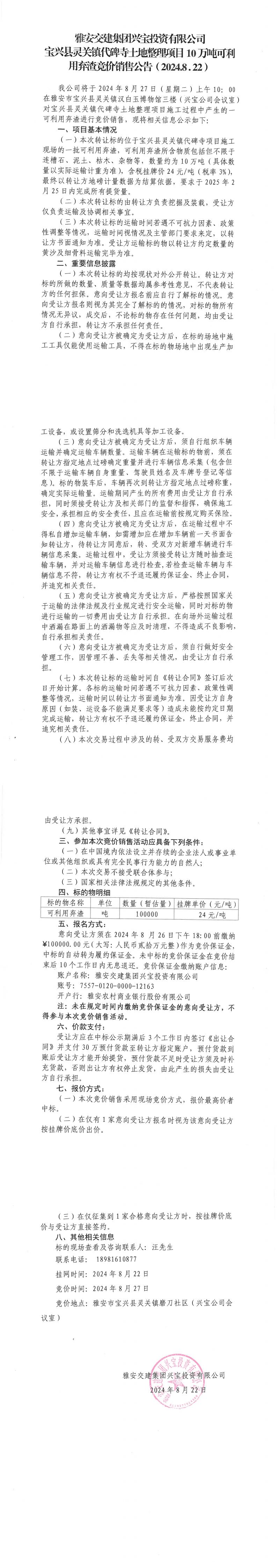 雅安交建集團(tuán)興寶投資有限公司寶興縣靈關(guān)鎮(zhèn)代碑寺土地整理項(xiàng)目10萬噸可利用棄渣競(jìng)價(jià)銷售公告(2024-8-22)_0