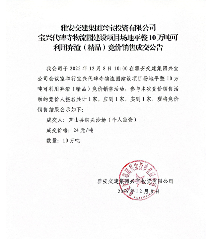 雅安交建集團(tuán)興寶投資有限公司10萬(wàn)噸可利用棄渣(精品)競(jìng)價(jià)銷售掛網(wǎng)公告(2025.12.04)