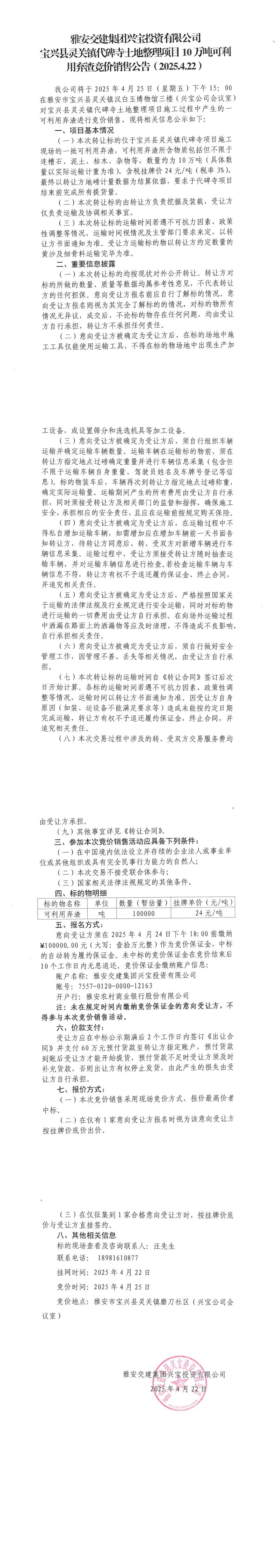 雅安交建集團(tuán)興寶投資有限公司寶興縣靈關(guān)鎮(zhèn)代碑寺土地整理項(xiàng)目10萬噸可利用棄渣競價(jià)銷售公告