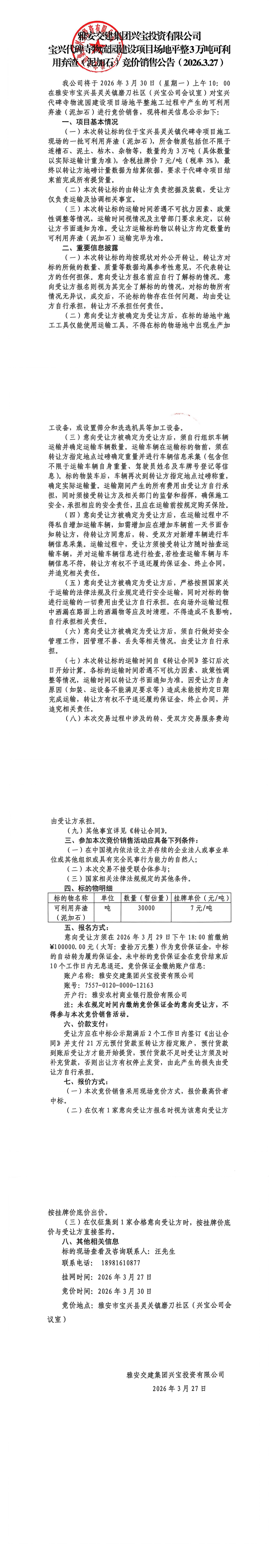 雅安交建集團(tuán)興寶投資有限公司3萬噸泥加石競(jìng)價(jià)銷售掛網(wǎng)公告(2026.3.27)